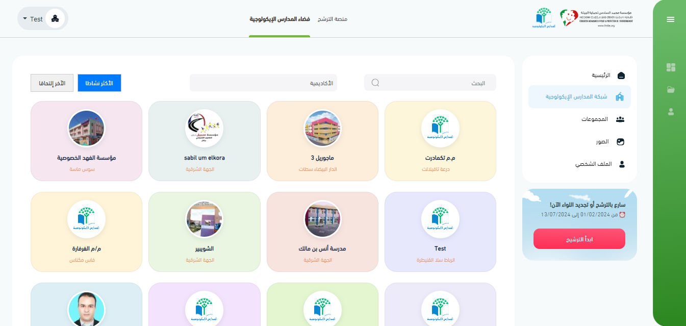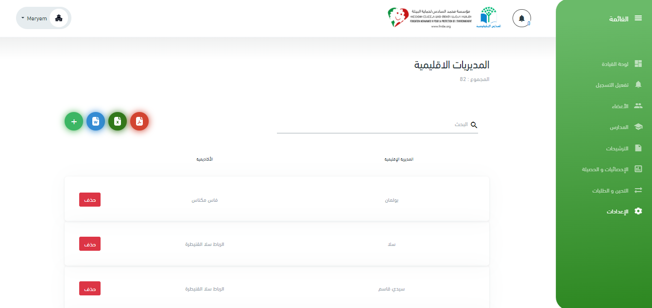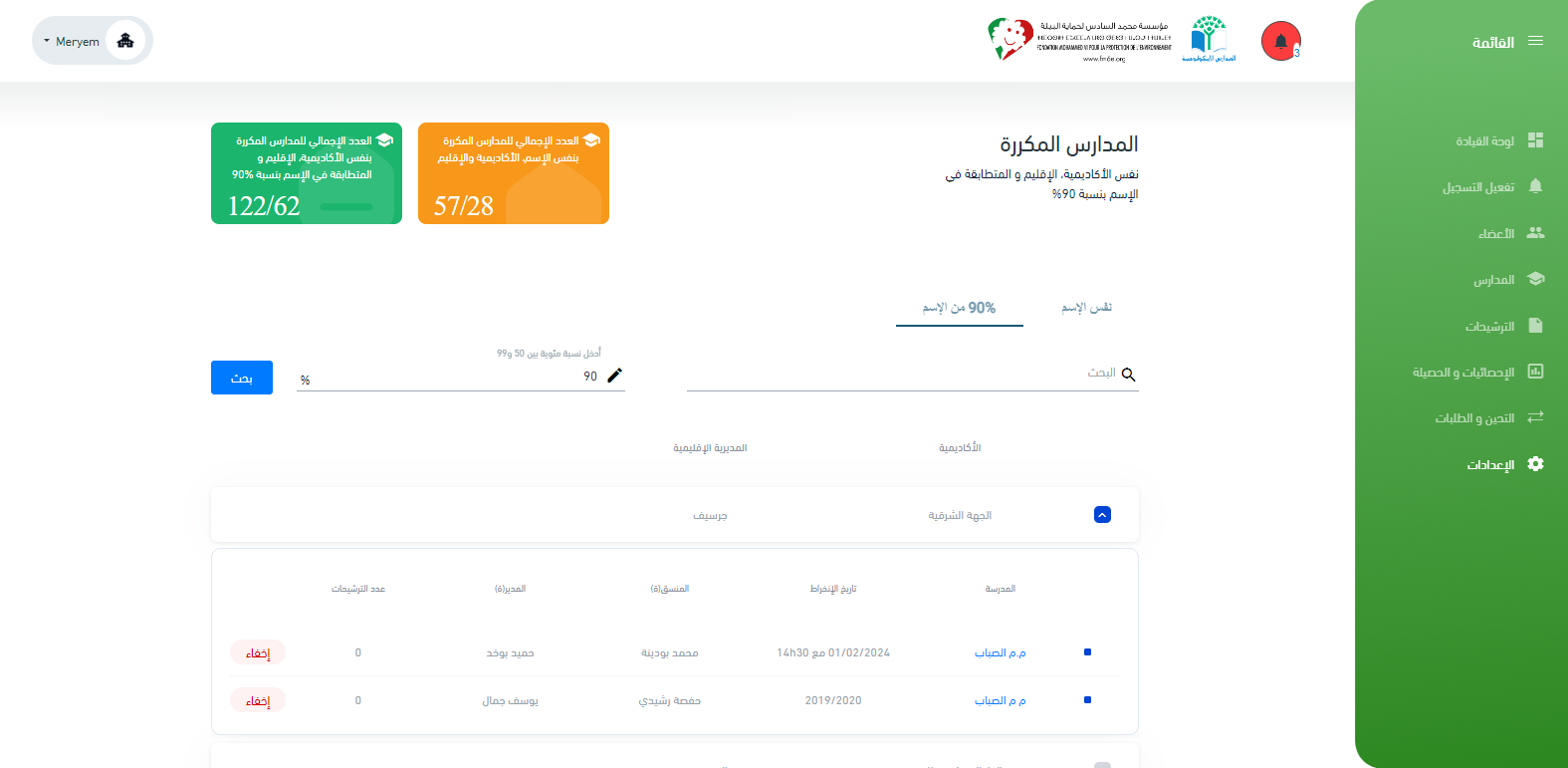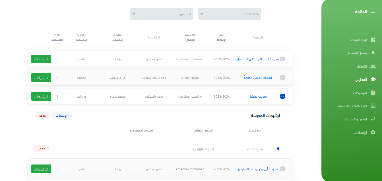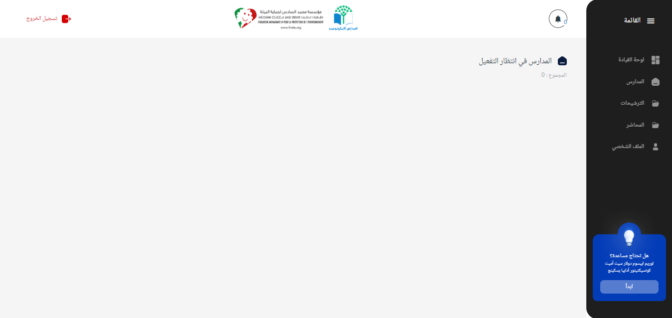 - "المدارس في انتظار التفعيل" Permet de consulter la liste des écoles qui attendent la validation de leur inscription dans la plateforme, et par la suite valider ou supprimer ces derniere