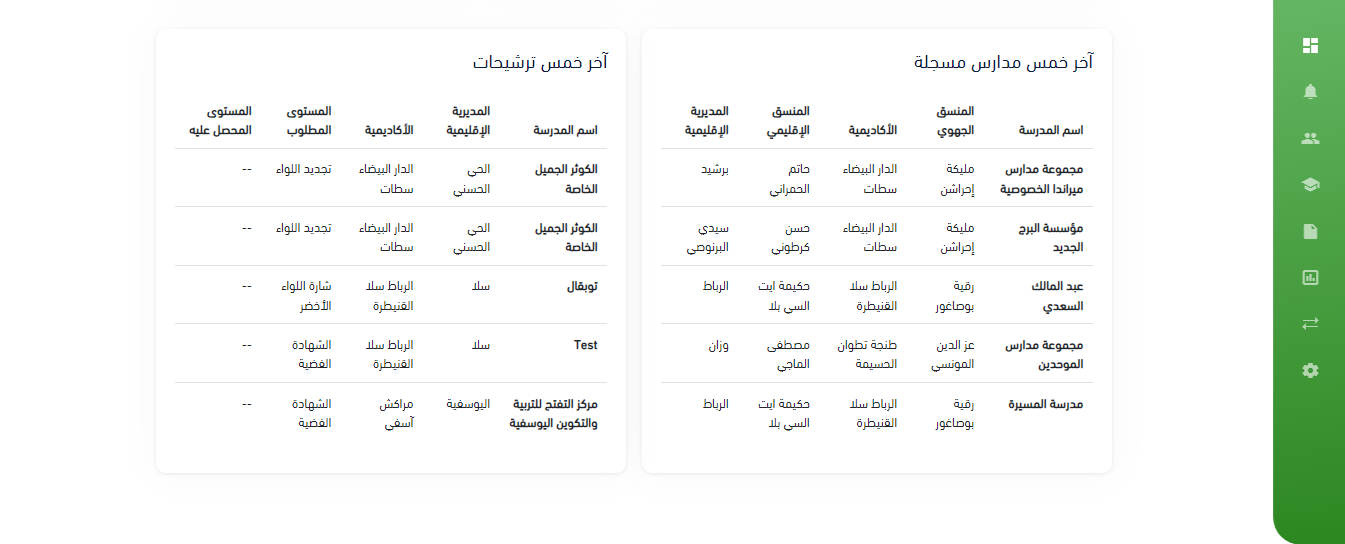 - "المدارس في انتظار التفعيل في الفضاء" : C'est une fonctionnalité obsolète avant l'harmonisation des deux plateforme (candidature et espace), ça permet d'affiche la liste des écoles qui attendent la validation de leur inscription de l'espace ecoecoles