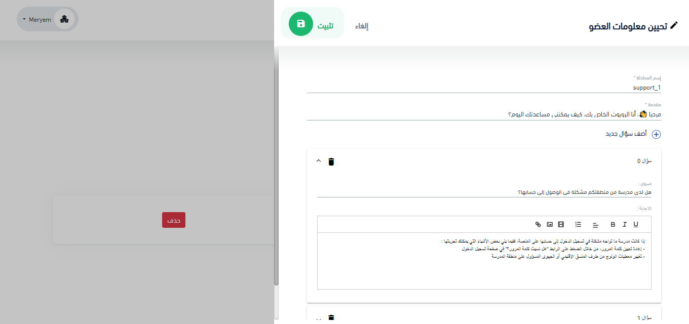 Permet de gérer le chat de support ajouté dans l'espace coordinateur. Ce chatbot propose des questions que le coordinateur peut poser. Dès qu'il choisit sa question, la réponse associée lui est donnée.