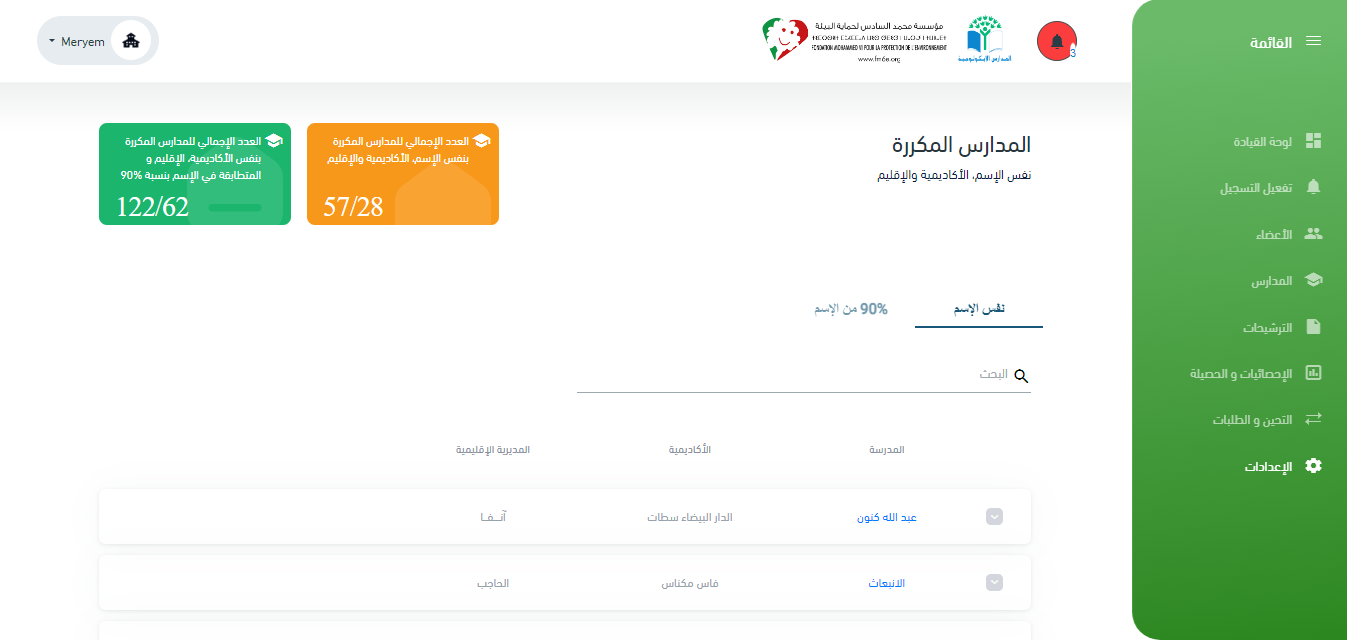 La deuxième tabulation, "pourcentage du nom" permet de trouver les duplications au niveau des délégations en détectant les comptes école qui ont presque les mêmes noms dans la même délégation.